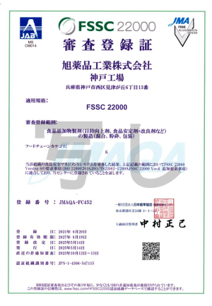 旭薬品工業は、安心して皆様にご利用頂ける商品を提供するため、神戸工場において 食品安全マネジメントシステムを構築し、2021年8月20日にFSSC22000認証を取得致しました。 これからも、食品安全マネジメントシステムの継続的改善を行い、食品安全方針を常に実現し 安心・安全な商品の提供に邁進して参ります。